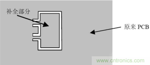 不規(guī)則形狀且沒拼板的PCB 應(yīng)加工藝邊。若PCB 上有開孔大于等于5mm×5mm的地方,在設(shè)計(jì)時(shí)要先將孔補(bǔ)全,以避免焊接時(shí)造成漫錫和板變形,補(bǔ)全部分和原有的PCB 部分要以單邊幾點(diǎn)連接,在波峰焊后將之去掉(見圖3.2)