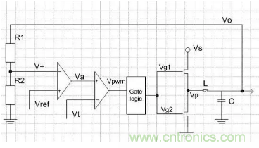 如上圖,為了從高電壓Vs得到Vo,開關電源采用了用一定占空比的方波Vg1,Vg2推動上下MOS管,Vg1和Vg2是反相的,Vg1為高,Vg2為低;上MOS管打開時,下MOS管關閉;下MOS管打開時,上MOS管關閉。由此在L左端形成了一定占空比的方波電壓,電感L和電容C我們可以看作是低通濾波器,因此方波電壓經過濾波后就得到了濾波后的穩定電壓Vo。Vo經過R1、R2分壓后送入第一個放大器(誤差放大器)的負端V+,誤差放大器的輸出Va做為第二個放大器(PWM放大器)的正端,PWM放大器的輸出Vpwm是一個有一定占空比的方波,經過門邏輯電路處理得到兩個反相的方波Vg1、Vg2來控制MOSFET的開關。