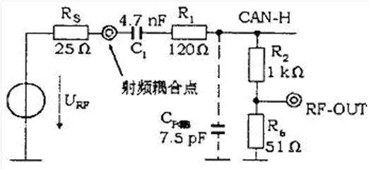 耦合網絡組成的要素是R1和C1,R1的選取應使CAN-H到搭鐵的耦合阻抗與IEC 61967-4規定的阻抗150×(1±0.2)Ω相匹配,同時C1的選取應使耦合網絡的等效阻抗接近于單線CAN網絡的典型負載。C1還決定了射頻耦合網絡在低頻范圍內的轉折頻率f: