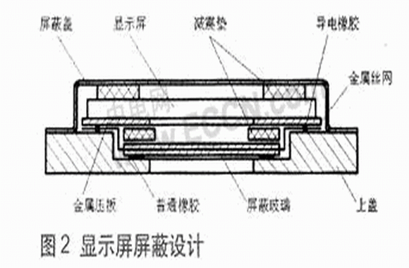 屏蔽玻璃安裝完畢,待粘膠涼干后再裝顯示屏。為了防止終端內部電路的干擾,最后用屏蔽蓋把顯示屏包圍起來。顯示屏的屏蔽結構如圖2所示。