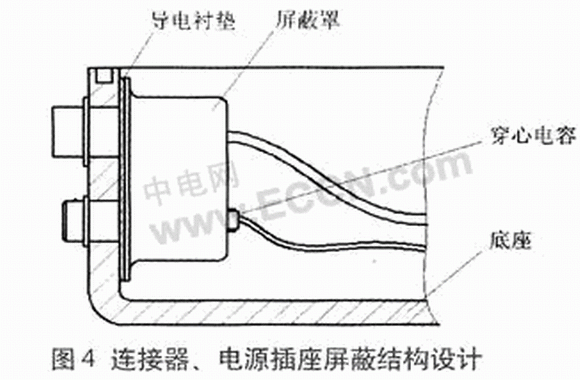 終端的通信連接器及電源輸入插座安裝在底座側面,需要在側面開口。為防止在開口處形成電磁泄露,可以在這些元件的后面裝屏蔽罩,穿過屏蔽罩的引線加裝穿心電容,焊接時引線通過穿心電容穿過屏蔽罩與元件相連。對于引入的電源插座,采用穿心電容實現電磁屏蔽。
