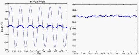 圖6輸入a相電壓和電流穩(wěn)態(tài)波形圖7輸出直流電壓穩(wěn)態(tài)波形
