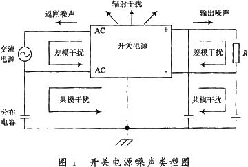 如圖1所示,電網中含有的共模和差模噪聲對開關電源產生干擾,開關電源在受到電磁干擾的同時也對電網其他設備以及負載產生電磁干擾,例如返回噪聲、輸出噪聲和輻射干擾等。進行開關電源EMI/EMC設計時,一方面要防止開關電源對電網和附近的電子設備產生干擾;另一方面要加強開關電源本身對電磁干擾環境的適應能力。下面用等效電路分別介紹共模和差模干擾產生的原因及路徑。