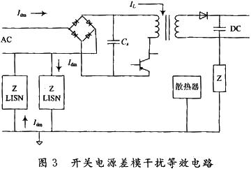 如圖3所示,當開關管轉為“開”時,儲能電容Cs的能量由AC電網和整流橋提供,他被開關管變換器的快速開關頻率所變換,并通過變壓器形成脈沖電流IL,他具有非常豐富的開關頻率諧波。儲能電容不是一個純電容,他有串聯電阻和電感。當整流橋處開關管“開”時,在AC電網端,IL會產生一個由電容的L,R,C所呈現的阻抗電壓,這就是開關電源產生差模發射源的原理。差模電流Idm和信號電流IL沿著導線、變壓器初級、開關管組成的回路流通。