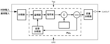 W181采用了頻率鎖相環(huán)(PLL)技術(shù)來調(diào)制輸入時(shí)鐘,其結(jié)果是得到一個(gè)輸出時(shí)鐘,它的頻率可緩慢地掃過一個(gè)接近于輸入信號(hào)的窄帶。基本電路結(jié)構(gòu)如圖2所示。