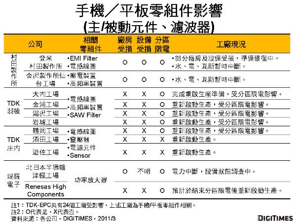 DIGITIMES Research最新報告指出,日本311強震造成日廠手機/平板相關零組件供應商分別遭受廠房、設備損壞,亦或海嘯沖擊、地方分區限電等影響,工廠作業停擺,影響超過20處工廠,在災后截至2011年3月16日仍未能正常作業。