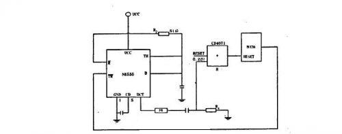 采用單穩(wěn)態(tài)觸發(fā)器NE555作為微機(jī)看門狗電路;當(dāng)系統(tǒng)工作正常時,看門狗電路不起作用,當(dāng)系統(tǒng)運行不正常時,80C51的P1.1引腳不能給定時器送去觸發(fā)脈沖,這時NE555中單穩(wěn)態(tài)觸發(fā)器就輸出脈寬大于4US負(fù)脈沖,經(jīng)F6反相后加至80C51的復(fù)位端,使系統(tǒng)可靠的復(fù)位,這樣可防止因外界干擾引起的程序跑飛,使微機(jī)程序正常運行,見圖1。