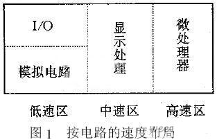 單元電路工作頻率越高,速度就越快,信號的頻譜也就越豐富;高頻分量比例越大,對外干擾也就越強(qiáng)。可根據(jù)單元電路的工作頻率分為高速電路(如微處理器),中速電路(如顯示處理),低速電路(如接口)和模擬電路(如模擬信號放大器)。多種速度電路在印制板上的布局一般如圖1所示。