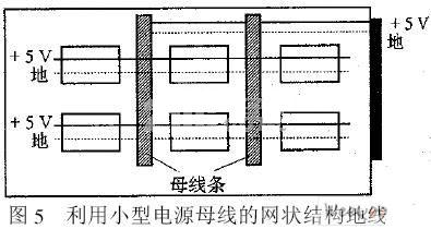 對于同類單元電路(或元器件)提高電磁兼容性效果的有效方法是采用網(wǎng)狀結(jié)構(gòu)地線如圖4所示。圖中實線為正面軌線,虛線為反面軌線,實線與虛線相互垂直,交叉點處由金屬化孔連接。這樣電流可以就近回流。圖4中的垂直地線可能給正面布線造成一定困難,可用小型母線來替代,并與電源供電線連結(jié)起來如圖5所示。圖中垂直的寬線條代表小型電流母線,可以裝卸,便于調(diào)度。