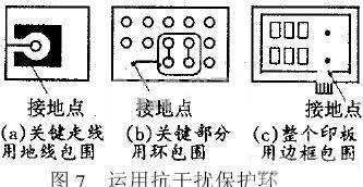 4.2在敏感元器件接線端頭和印制板的邊框用地、環(huán)保護(hù)起來,如圖7所示。注意保護(hù)環(huán)不能充當(dāng)電流回線,只能單點接地。