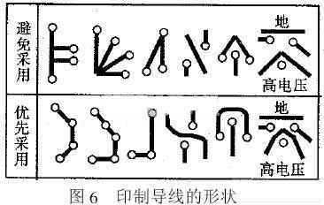 4.1 走線形狀不要有纏結(jié)和分支或硬拐角。因為那樣可能會破壞導(dǎo)線特性阻抗的一致性或?qū)е路瓷浜彤a(chǎn)生諧波或局部高電壓引起放電現(xiàn)象。一般優(yōu)先選用和避免采用的印制導(dǎo)線形狀,如圖6所示。