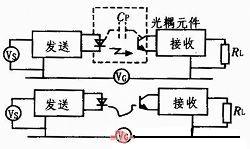 用光傳輸信號是解決地環(huán)路問題的理想方法。如圖3所示,光耦器件的寄生電容為2 pF左右,因此能夠在很高的頻率起到隔離作用。如果使用光纖,則沒有寄生電容的問題,能夠獲得十分完善的隔離效果。但是,用光纖會帶來其它問題,如:需要更大的功率、需要更多的外圍器件,光連接的線形和動態(tài)范圍都達不到模擬信號的要求、光纜的安裝和維護比較復(fù)雜等,使用時應(yīng)注意。