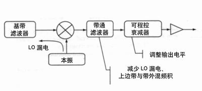 為了解決信號發(fā)生器的需求,一個上變頻器將信號從1.1GHz~2.2GHz頻帶變換至4.9GHz~6GHz頻帶。表2列出了上變頻器的兩種技術(shù)。同樣,我們選擇基本混頻方案。上變頻器的方框圖基本上和下變頻器類似,只是作些變更以適應(yīng)輸入頻率低于輸出頻率(圖2)。同樣可以用2dB衰減器來改善混頻器每個端口的匹配度。用相同的混頻器和開關(guān)來提供變頻或直通性能。上邊帶由輸出級的帶通濾波器除去,最終的輸出電平用可程控衰減器進行高速調(diào)整,為了便于觀察,針對頻譜倒置的校正是必不可少的。