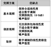 表1列舉了3種主要的下變頻技術(shù),同時指出了各自優(yōu)缺點。基本混頻似乎是最佳方案。在4.6GHz~6GHz下變頻場合,使用固定頻率的本振,1.1GHz輸出信號的頻帶與輸入信號頻帶相同,因此稱為區(qū)變頻。