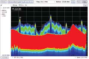 圖7 使用DPX在5s后發現的偶發瞬態信號。紅色區域是頻繁發生的信號,藍色部分和綠色部分是瞬態信號