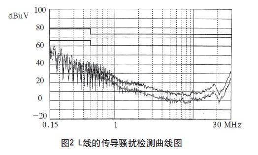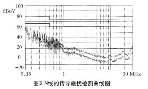 在3m法電波暗室對(duì)試驗(yàn)樣機(jī)進(jìn)行測試,其L、N線的傳導(dǎo)騷擾檢測曲線如圖2、3所示,輻射騷擾的垂直極化掃描曲線如圖4、5所示。