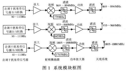 當前通信制式下,基于FDMA/TDMA體制的GSM手機和基于CDMA體制的CDMA手機均是通過接收基站發(fā)射的某一頻率的電平信號實現(xiàn)通信。因此每一個手機接收機都有一個抗干擾容限,只要干擾信號與干擾目標使用相同頻率且信號電平超過接收機的抗干擾容限,就使通信不能進行,從而實現(xiàn)通信干擾。