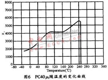 中小功率的EMI濾波器產品中選用最多的磁芯材料是日本TDK公司 的PC40 (它是目前業界廣泛使用的較好的材料之一),它的初始磁導μi隨溫度的變化曲線如圖6所示。從圖中可看出,溫度變化對μi的影響是很大的,磁芯溫度在 90~150℃的區間內,有一段平坦區,這時它的μi大約在4100左右;當溫度低于90℃后,μi值會隨著溫度的降低而逐漸減小,到0℃時,μi值只有 2000左右,進到負溫區后,μi值還會進一步減小;而當溫度高于150℃后,μi值則會隨著溫度的升高而增加,當達到240℃時,μ的最大值為5600 左右;從240℃開始,μi值又漸漸減小,當溫度達到居里溫度點250℃時,材料失去磁性。