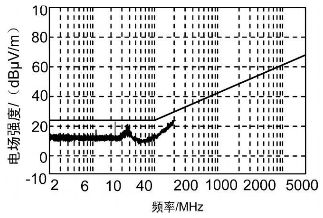 對RE102 試驗項目進行觀察,發(fā)現(xiàn)測試結(jié)果圖的超標點為24 MHz、36 MHz 兩點,而這兩點分別是12 MHz 頻率點的二三次諧波。為了找到這一頻率點的元器件,對機箱內(nèi)各單元進行了分析,發(fā)現(xiàn)控制保護單元中有一個12MHz 晶振,由于晶振屬于高噪聲元器件,能夠產(chǎn)生較強的輻射,從而使其周邊充滿著近場輻射場。如果輻射場內(nèi)有器件或走線,晶振及其諧波信號將耦合到器件或走線上而輻射出去;再者又發(fā)現(xiàn)控制保護單元的PCB 板未采取就近接地措施,只是通過一根長引線和機殼地相連,造成信號的環(huán)路面積增大,產(chǎn)生了很強的輻射,所以對控制保護單元采取措施應該是行之有效的。首先對晶振進行屏蔽且屏蔽體就近接地,弱化輻射發(fā)射強度; 然后控制保護單元的PCB 板同樣采取就近接地措施,并且在屏蔽盒出口處的信號線上安裝一個鐵氧體磁環(huán),可以將不需要的高頻干擾抑制掉。通過采取以上措施后,RE102 試驗指標合格,如圖3 所示。