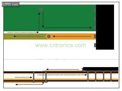 接地參考是最佳策略,但高速線路有時候可布置在內部層上。接地參考層上下都放置非常困難,半導體廠商可能會受到引腳限制,把電源線安放在高速線路旁邊。參考電流要是需要在非DC耦合的各層或各網之間切換,應緊挨著開關點安放去耦電容。
