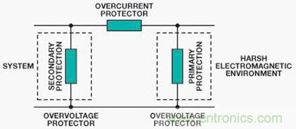 圖5顯示一個(gè)典型保護(hù)方案,其特征是具有兩重保護(hù):主保護(hù)和次級(jí)保護(hù)。主保護(hù)可將大部分瞬變能量從系統(tǒng)轉(zhuǎn)移開,通常位于系統(tǒng)和環(huán)境之間的接口。它旨在將瞬變分流至地,從而消除大部分能量。