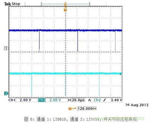 圖 5顯示了13.2V輸入的開關(guān)節(jié)點(diǎn)??梢钥吹?,LT8614與理想方波的偏離極小,如通道2所示。圖3、4和5中的所有時間域測量結(jié)果都是用 500MHzTektronixP6139A探頭測得的,封閉的探頭尖端屏蔽罩連接至PCBGND平面,測試均在標(biāo)準(zhǔn)演示電路板上進(jìn)行。[page]