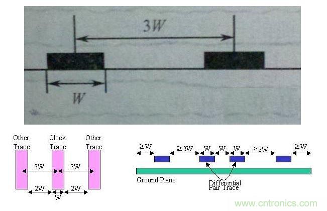 3W原則是指多個高速信號線長距離走線的時候,其間距應該遵循3W原則,例如時鐘線,差分線,視頻、音頻信號線,復位信號線及其他系統關鍵電路需要遵循3W原則,而并不是板上所有的布線都要強制符合3W原則。