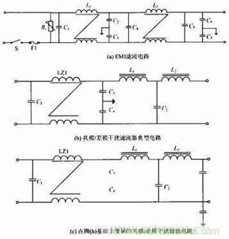 開關(guān)電源對內(nèi)、外的干擾及抗干擾中,共模信號與開關(guān)器件的工作方式、散熱器的安裝及整機PCB板與機殼的連接有相當(dāng)復(fù)雜的關(guān)系,共模信號在一定 的條件下又可轉(zhuǎn)變成差模信號。其中解決共模干擾除了上述一般的EMI濾波電路,還可按如下電路圖的思想在電路上改進,使開關(guān)電源能夠在電路上改進從而提高 性能。圖1(b)為共模/差模干擾濾波器典型電路,圖1(c)為在圖1(b)基礎(chǔ)上變異的共模/差模干擾濾波電路。