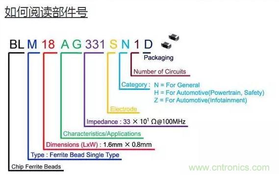 下圖以型號BLM18AG331SN1D為例說明磁珠的命名規則