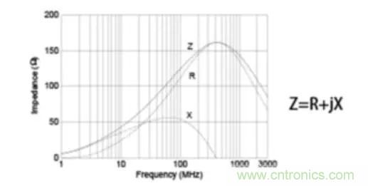 下圖顯示片狀鐵氧體磁珠的阻抗頻率特性的示例。所涉及的基本原理如下:隨著頻率上升,阻抗隨著電感器的增加而成比例增加,因此通過在電路中串聯連接這些磁珠,它們起到低通濾波器的作用。對于常規電感器,阻抗(Z)值中的主要特征是電抗分量(X)。