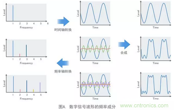 在我學生時代碰到的噪聲中,計算機的時鐘頻率約為4MHz。但是,例如在日本,用于調頻廣播的頻段為76MHz或更高。噪聲源的時鐘頻率不會與廣播頻率重疊。那問題為什么會出現呢?數字信號是由基波正弦波和其整數倍的諧波組成的方波,如圖A所示。方波的上升越急劇,其包含的高次諧波分量越高。這意味著實際的數字信號具有與調頻廣播頻帶重疊的諧波分量,從而導致調頻收音機的聲音中產生噪聲。