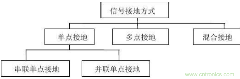 接地沒有一個很系統的理論或模型,人們在考慮接地時只能依靠他過去的經驗或從書上看到的經驗。接地的方法很多,具體使用那一種方法取決于系統的結構和功能。接地的方式可以分為三種:單點接地,多點接地和混合接地。其中單點接地可以分為串聯單點接地和并聯單點接地兩種,如圖所示。