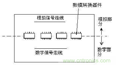 另外,也有一種統一地的處理方法,也就是不進行地分割,但規定各自的范圍,保證數字和模擬走線及回流不會經過對方的區域。這種策略一般實用于數模器件比例相當,并存在多個數模轉換器件的情況,有利于降低地平面的阻抗,參考地線設計如圖8-13所示: