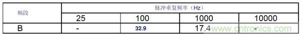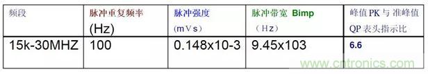 由表可知,峰值測量結果≥準峰值測量結果。下表中中列出了輸入標準脈沖,在標準寬帶情況下峰值與準峰值表頭指示之比值。峰值測量時的絕對脈沖特性