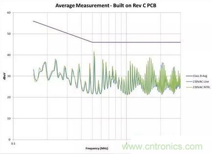 我通過簡單調整電路板(無電路變化),將噪聲降低了大約 6dB。見圖 2 和圖 3 的測量結果。在有些情況下,接近高 dV/dt 進行輸入線路布線甚至還可擊壞共模線圈 (CMC)。