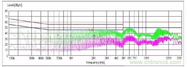 上圖藍色和黑色線是輸出正負端,上面套了個磁環(huán),解決了輸出整流管引起的高頻端超出;有些時候端口的干擾在PCB板上加濾波器未必有效果,在輸出線上放磁環(huán)就有想不到的效果。