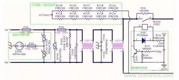 上面的電路對EMC的影響可想而知,輸入端的濾波器都在這里;防雷擊的壓敏;防止沖擊電流的電阻R102(配合繼電器減小損耗);關(guān)鍵的慮差模X電容以及和電感配合濾波的Y電容;還有對安規(guī)布板影響的保險絲;這里的每一個器件都至關(guān)重要,要細細品味每一個器件的功能與作用。設(shè)計電路時就要考慮的EMC嚴酷等級從容設(shè)計,比如設(shè)置幾級濾波,Y電容數(shù)量的個數(shù)以及位置。壓敏大小數(shù)量選擇,都與我們對EMC的需求密切相關(guān),歡迎大家一起討論看似簡單其實每個元器件蘊含深刻道理的EMI電路。