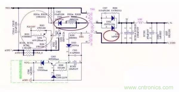 右邊綠色虛線方框部分,是MOS管關(guān)斷尖峰吸收電路,一樣與MOS管構(gòu)成環(huán)路要最小;