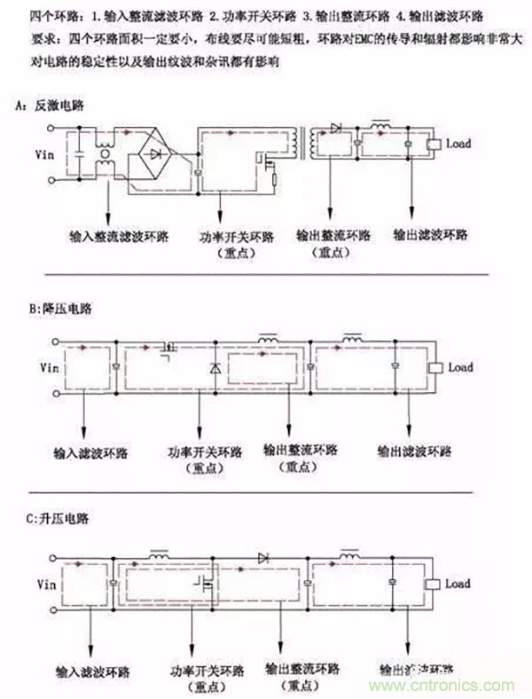 另外二大重要環(huán)路,一是MOS管開通環(huán)路(虛線紅色圖),另一個是MOS管關(guān)斷環(huán)路(實線紅色圖);環(huán)路面積盡可能小;