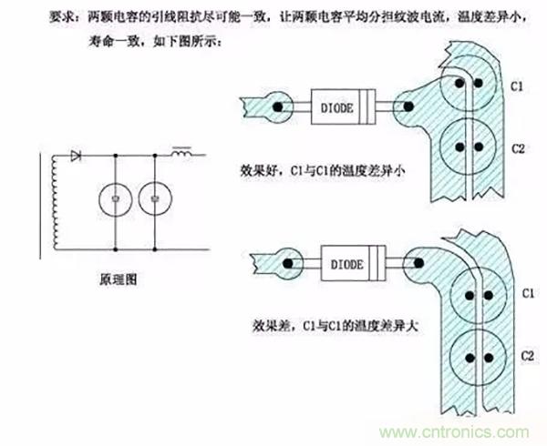 圖一是副邊整流濾波走法,使二個電容效果分攤,避免第二個電容在整流回路中失效。