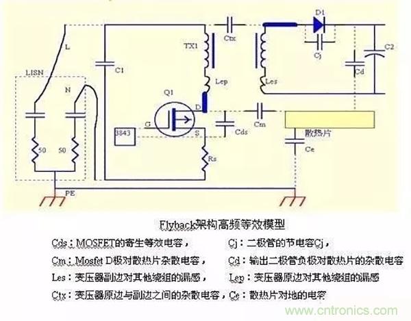 EMC的路徑,當然空間輻射是跟環(huán)路有關(guān),環(huán)路也是路徑構(gòu)造成的;分析出反激高頻等效模型,幫助理解EMC形成的機理;我們的測試接收設(shè)備會從L,N端接收傳導(dǎo),為了減小接收的干擾,就必須讓干擾通過地回路流通而不從L,N端口流向接收設(shè)備;這時候我們的EMI電感以及Y電容通過阻抗匹配就可以實現(xiàn);另外原邊的干擾可以通過原副邊Y電容,變壓器雜散電容以及大地耦合到副邊,形成更多的回路;當然一些結(jié)電容參數(shù),如MOS管結(jié)電容,散熱器結(jié)電容也能構(gòu)成流通路徑;