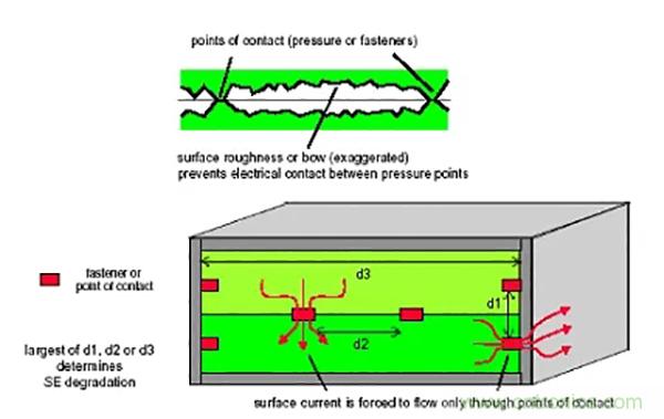 d、屏蔽體的電連續(xù)性是影響結(jié)構(gòu)件屏蔽效能最主要的因素,相對(duì)而言,一般材料本身屏蔽性能以及材料厚度的影響是微不足道的(低頻磁場(chǎng)例外);