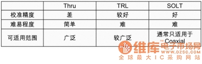 在三種常用的測試儀器中,網(wǎng)絡(luò)分析儀的校準(zhǔn)方法最為嚴(yán)謹(jǐn),頻譜分析儀次之,示波器的校準(zhǔn)方法最為簡單。因此,我們這里主要討論網(wǎng)絡(luò)分析儀的校準(zhǔn)方法。網(wǎng)絡(luò)分析儀常用的校準(zhǔn)方法有三種,thru、trl和solt。三種方法的特性如表1所示。