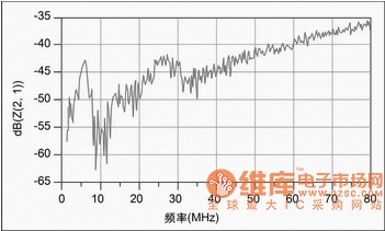 測試電源系統(tǒng)性能時,通常使用網(wǎng)絡(luò)分析儀,測試對象是電源系統(tǒng)的self-impedance和transfer-impedance。一般情況下,電源系統(tǒng)的阻抗均遠(yuǎn)小于網(wǎng)絡(luò)分析儀系統(tǒng)阻抗(50歐姆),所以測試時只要做直通校準(zhǔn)就可以了,利用公式s21=z/25就可以得到電源系統(tǒng)的阻抗。圖2所示為某單板電源阻抗特性。