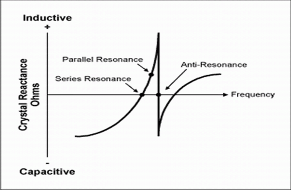 通過添加外部元件(通常是電容),石英晶體可振蕩在串聯(lián)與反諧振頻率之間的任何頻率上。在晶體工業(yè)中,這就是并聯(lián)頻率或者并聯(lián)模式。這個頻率高于串聯(lián)諧振頻率低于晶體真正的并聯(lián)諧振頻率(反諧振點)。圖2給出了典型的晶體阻抗與頻率關(guān)系的特性圖。
