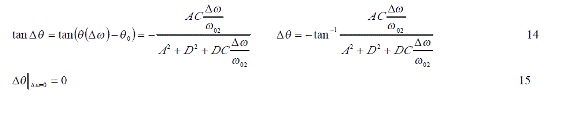 設定電路參數為f02=83kHz、f01=800Hz、Q1=0.1、Q2=70、M2/L2=0.2、M1/L1=0.1、M1/L2=10-4、R 2/Ri=10-3時在Mathcad下仿真結果如圖 2所示,其中振幅特性是歸一化后的特性, d=Δf。從圖中可以看出有跳周現象,這是由于式 8分式中分母部分發生歸零引起的。該點角頻率差定義為 Δω0,則由式 8可以得出以下關系式。
