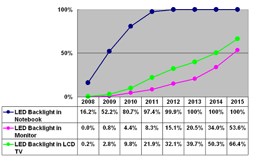 同時,2013年采用LED背光的大尺寸(指10寸及以上尺寸)面板出貨量將從2009年約8千490萬片成長到4億3千480萬片,將占LED背光市占率估計為54.3%,LED背光將成為市場主流規(guī)格。其中notebook PC將是LED背光主要應用,依據DisplaySearch分析到了2012年百分之百notebook PC都將采用LED背光。