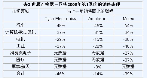 2009年第一季度已經(jīng)過去,連接器產(chǎn)品訂單劇降41.7%,銷售則下挫了35.7%,這兩項數(shù)據(jù)結(jié)果均創(chuàng)下了連接器工業(yè)的歷史新低。在上一次表現(xiàn)最糟糕的2002年第四季度,銷售和定單下降了31.2%。所有最終應(yīng)用市場均報告直線下降,一片蕭條跡象。三家世界最大的連接器公司泰科電子(Tyco Electronics)、安費諾(Amphenol)和莫列克斯(Molex)也均報告與上一年同比銷售嚴(yán)重下降,如下表3所示。