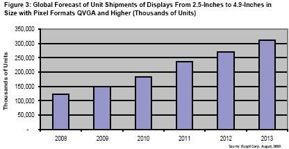 下圖所示為iSuppli公司對(duì)對(duì)角尺寸介于2.5英寸及4.9英寸之間、像素格式為QVGA及更高的LCD顯示屏全球出貨量的預(yù)測(cè)。