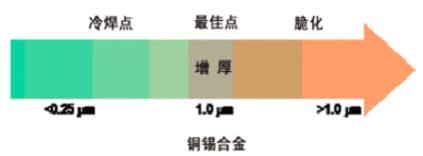 更高溫度和與被焊接部件更長時間的接觸也可能增加金屬化合物的結合層。從而不建議延長接觸時間和重復返工。上圖表顯示了隨著結合層的厚度增加,脆化現象發生的機率就更大。[page]